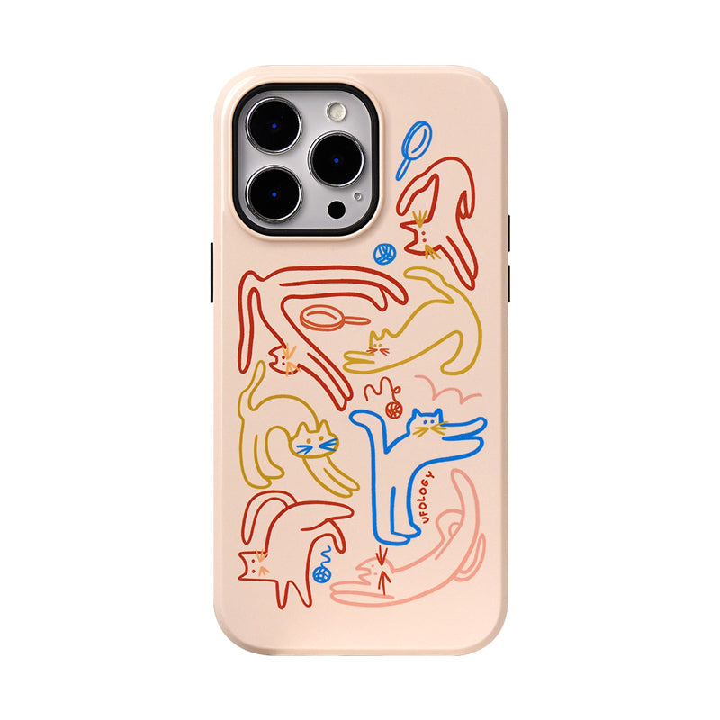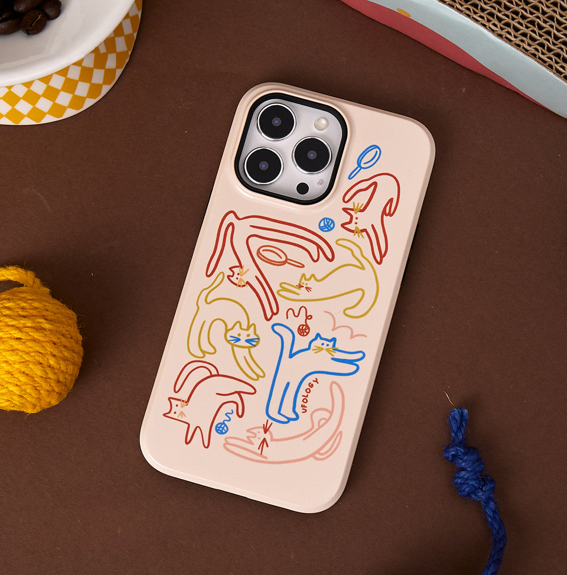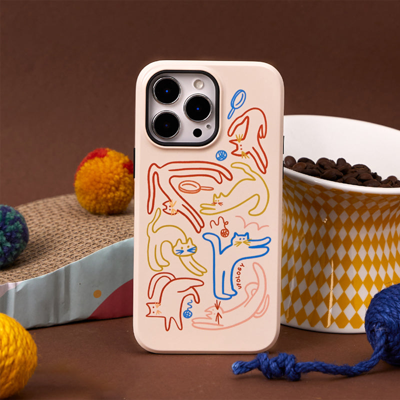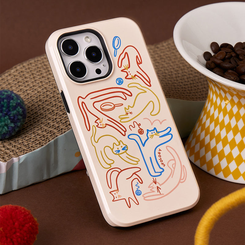 かわいい猫イラストが特徴の二重構造デザインスマホケース。フィルム加工により、透明感のある仕上がりでイラストの可愛さがより引き立ちます。背面には実用的なスタンドを搭載し、動画視聴やビデオ通話に便利。デザイン性と機能性を兼ね備え、普段使いにもプレゼントにもぴったりのスマホケースです。