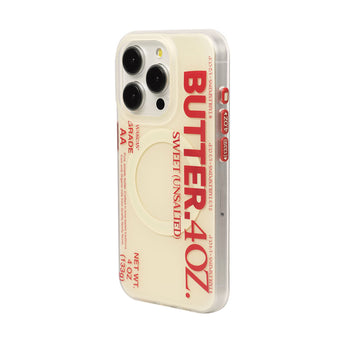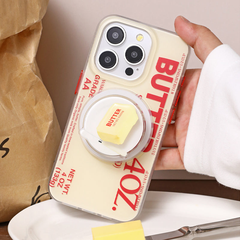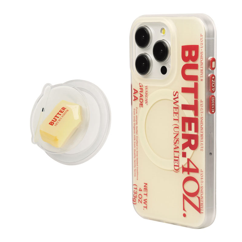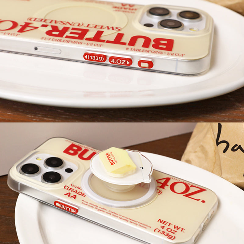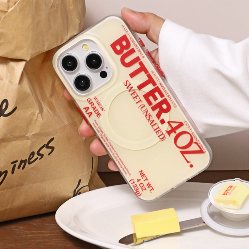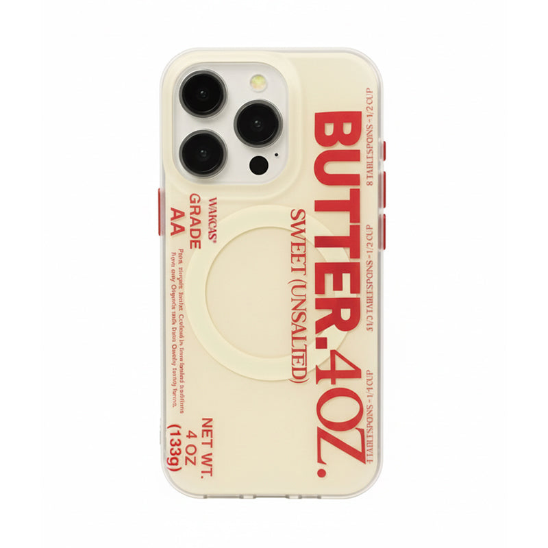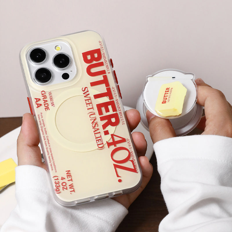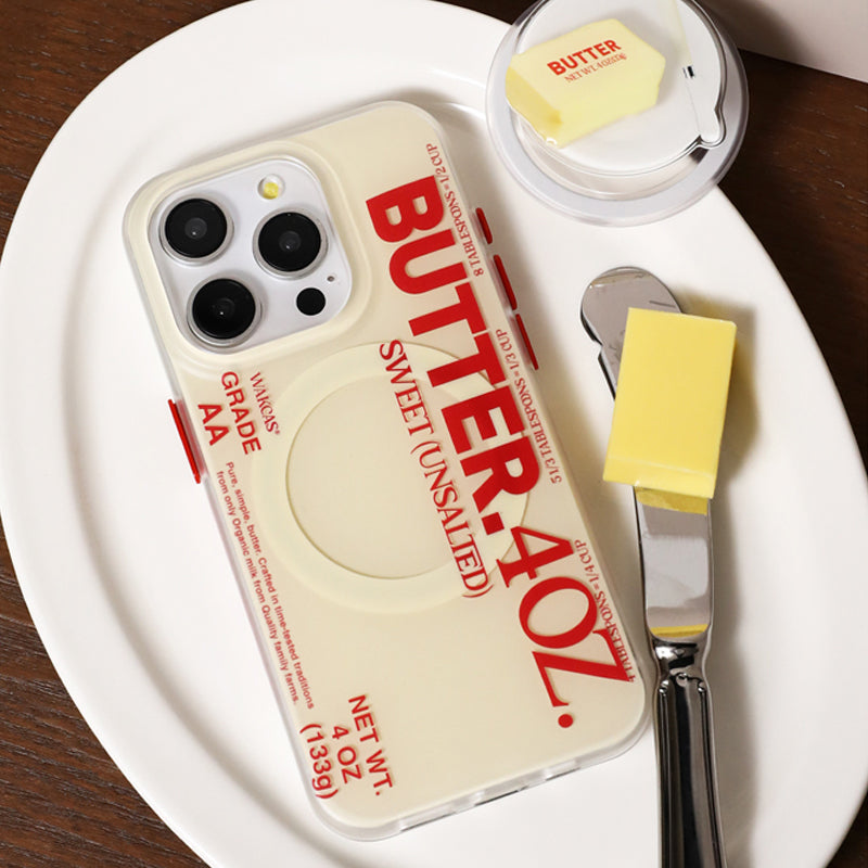 バターをモチーフにしたユニークな英文デザインのマグネット式スマホケース。マット加工仕上げで指紋が付きにくく、さらりとした手触りが魅力です。背面にはスタンド機能が付いており、動画視聴や作業時に便利です。デザイン性と実用性を兼ね備えた、おしゃれなスマホケースです。