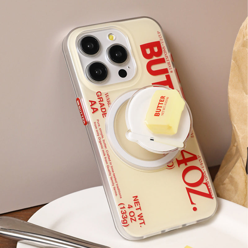 バターモチーフ英文デザインスタンド付きマグネット式スマホケース