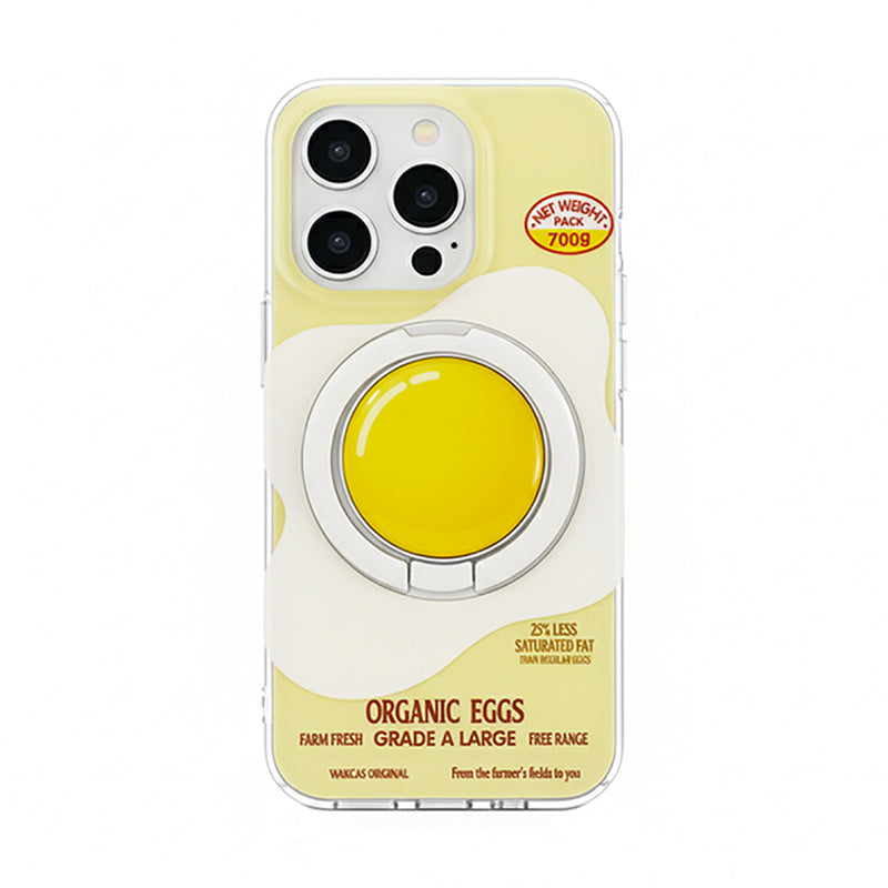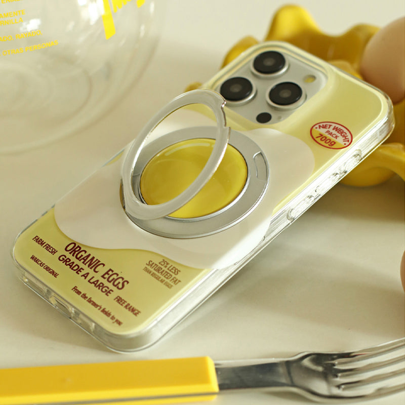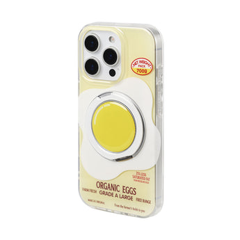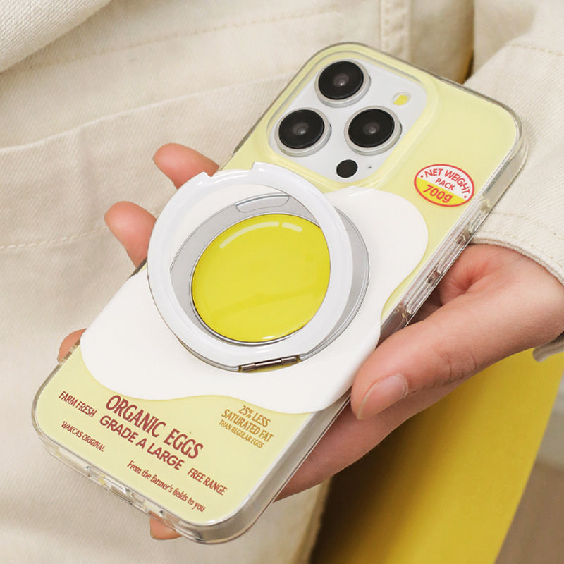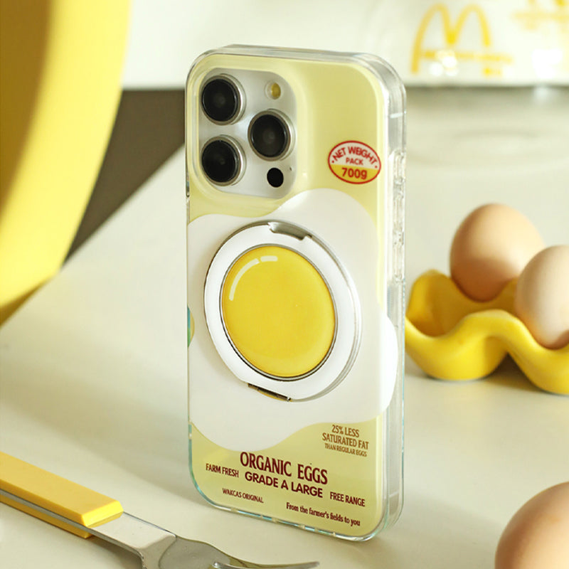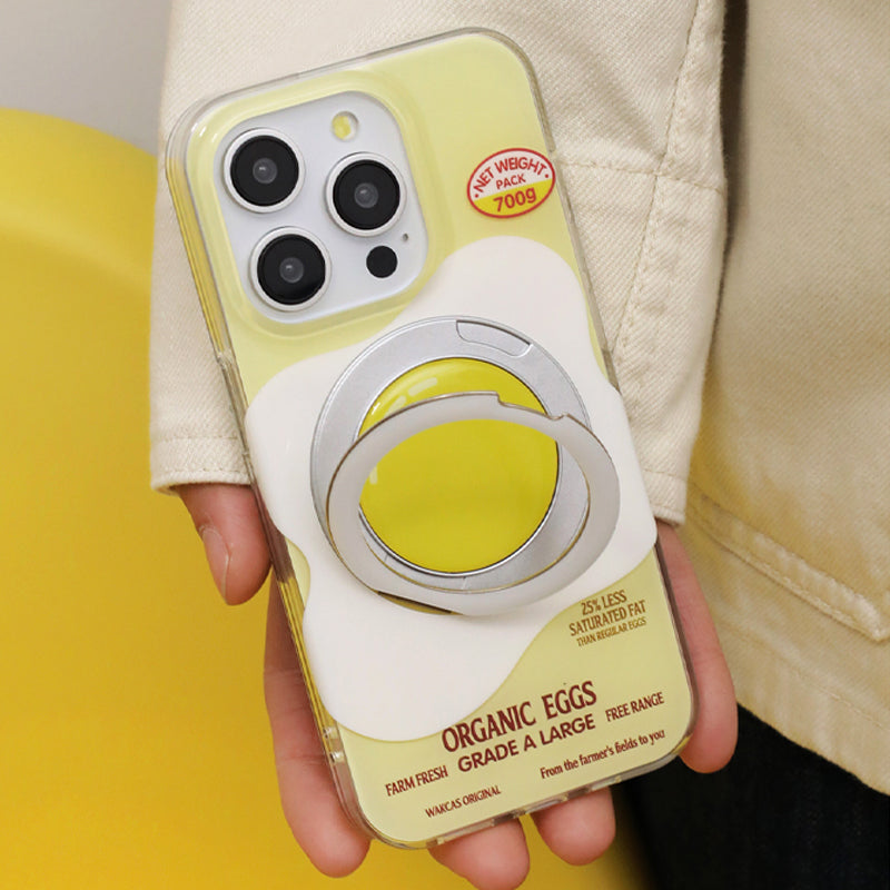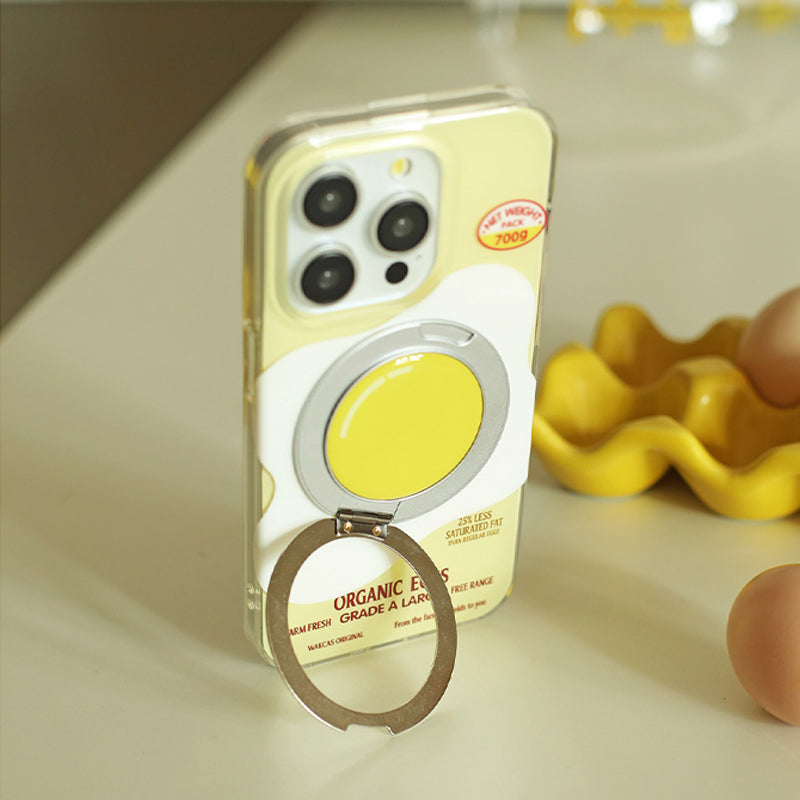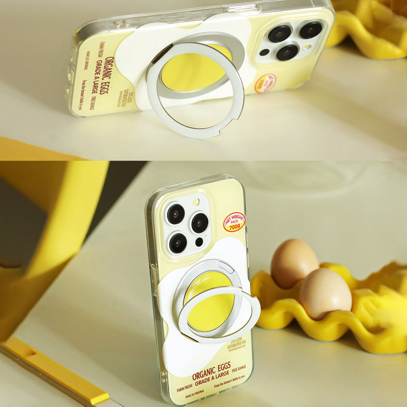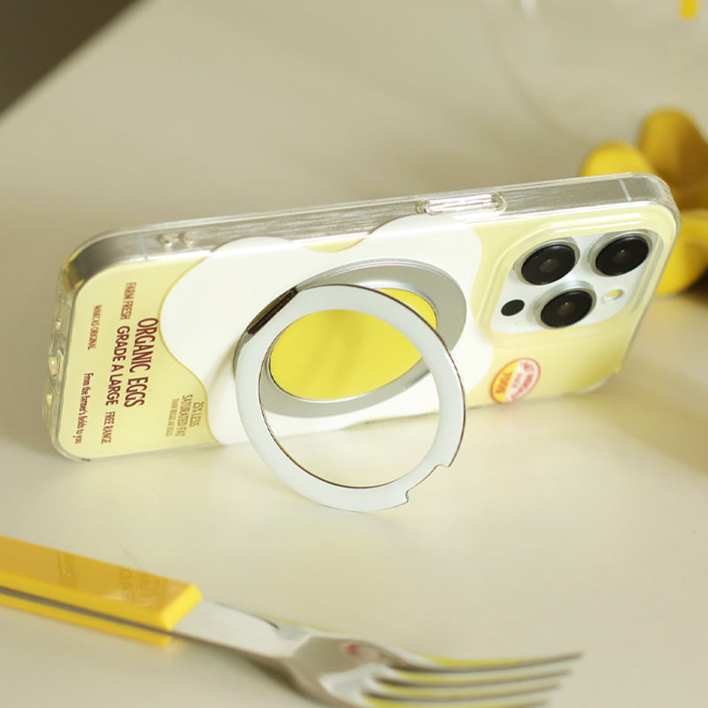 目玉焼きをモチーフにしたユニークで可愛いデザインのスマホケース。背面には回転式スタンドを搭載し、動画視聴やビデオ通話時に便利です。スタンドは一体型デザインで、使用しない時もスッキリとした見た目に。可愛らしさと実用性を兼ね備えたデザインで、毎日のスマホライフを楽しく彩ります。