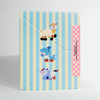 可愛い動物イラストと爽やかなストライプデザインが魅力のiPadケース。ペンスロット付きでApple Pencilをスマートに収納可能。マグネット式で着脱が簡単、スタンド機能も備え、動画視聴や作業に最適。軽量ながら耐衝撃性に優れ、大切なiPadをしっかり保護します。