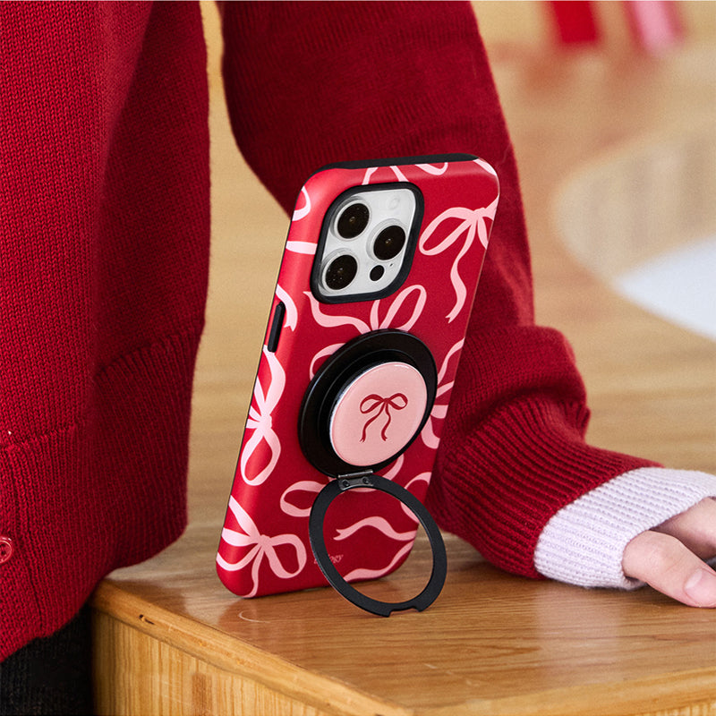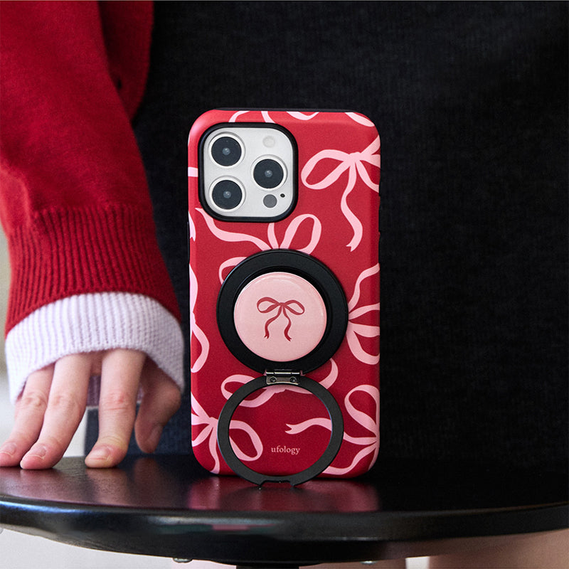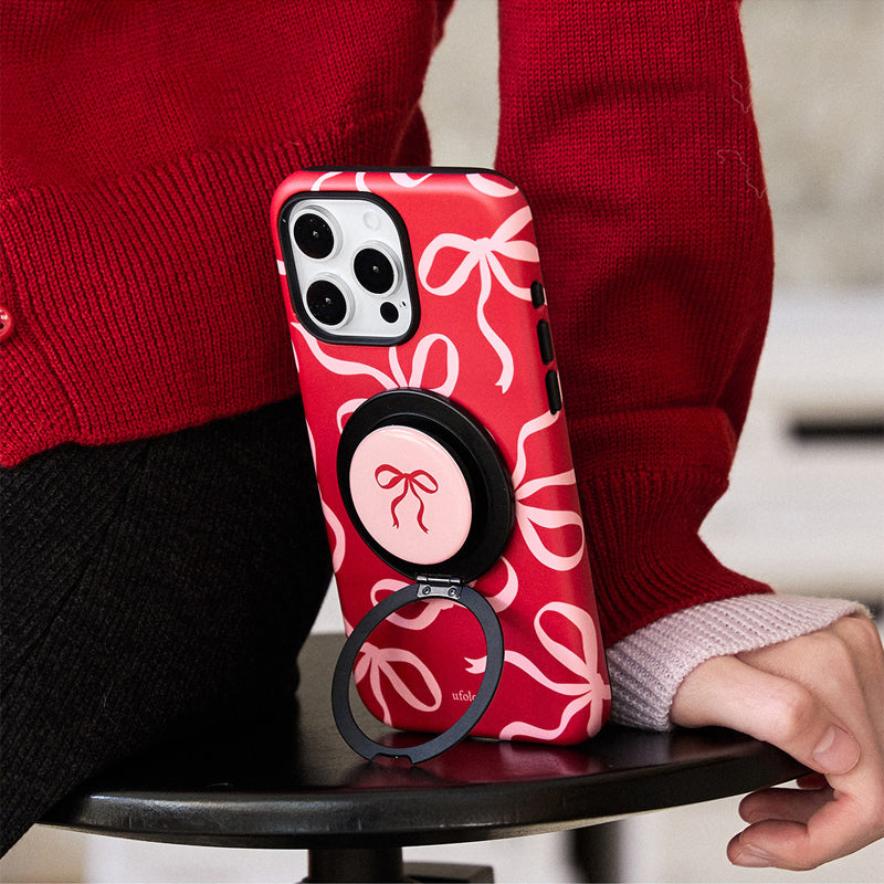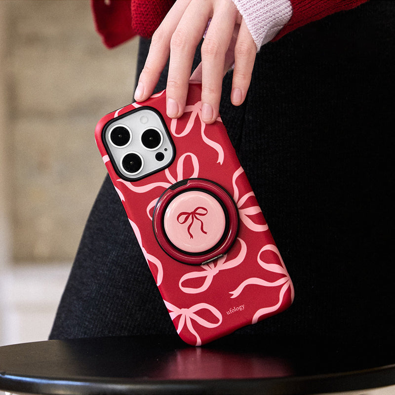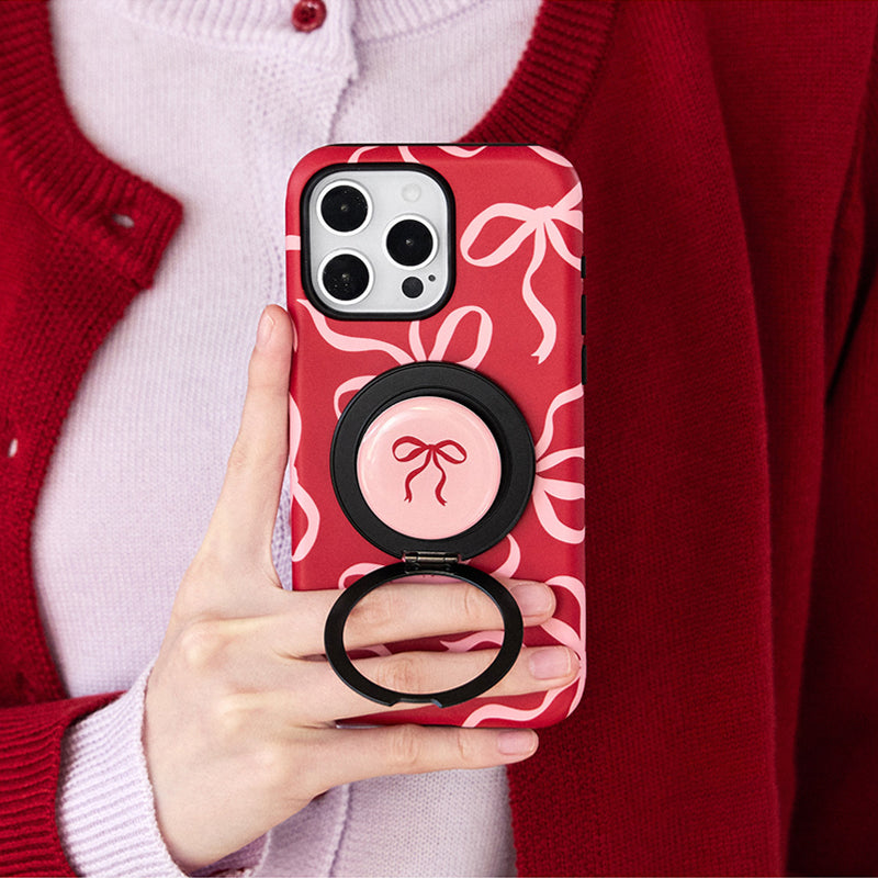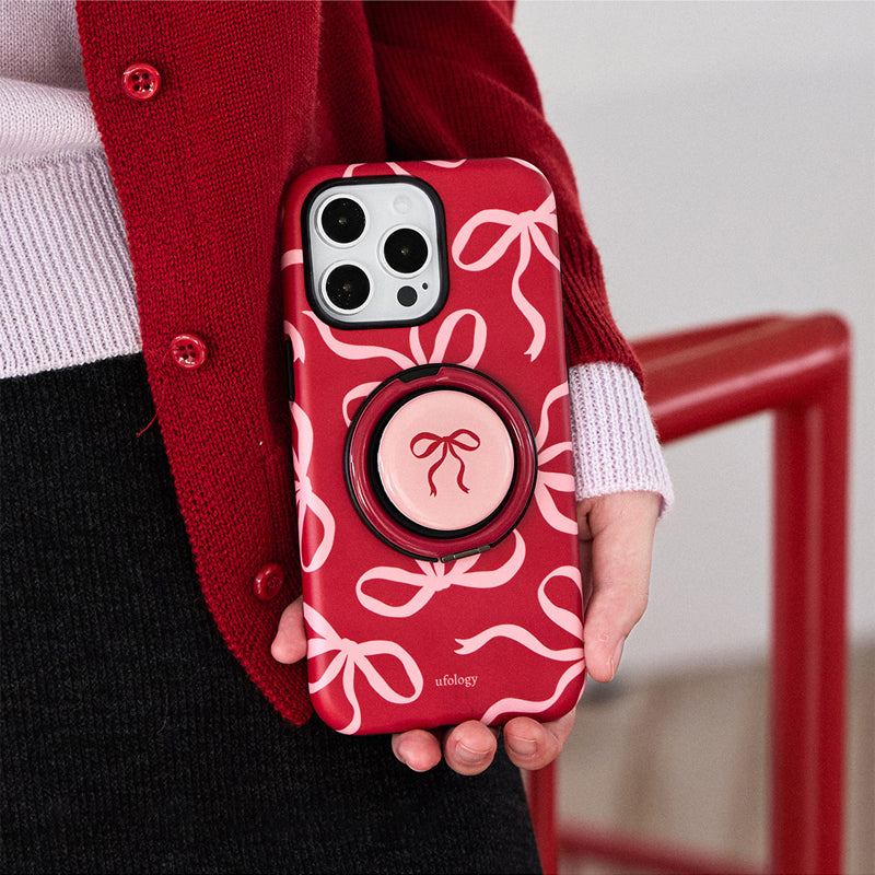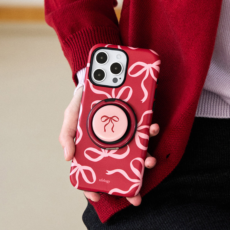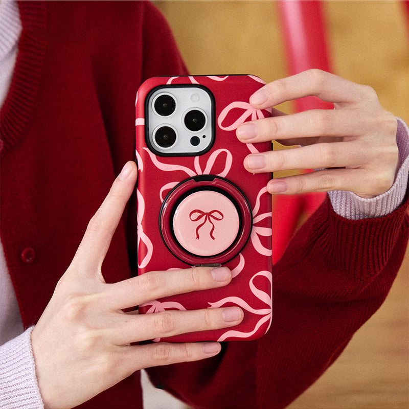 リボンデザインを施した、甘くて可愛らしいスマホケース。鮮やかな赤色に、リボンのアクセントが可愛さを引き立て、手元に優しさを添えます。回転式リングスタンドが搭載されており、動画視聴やビデオ通話時にも便利に使えます。