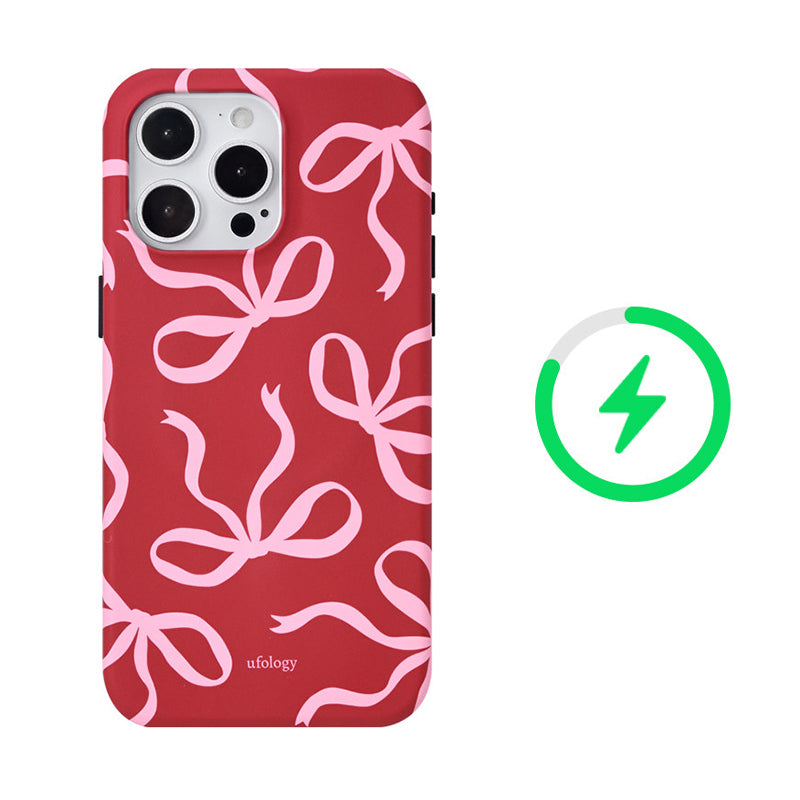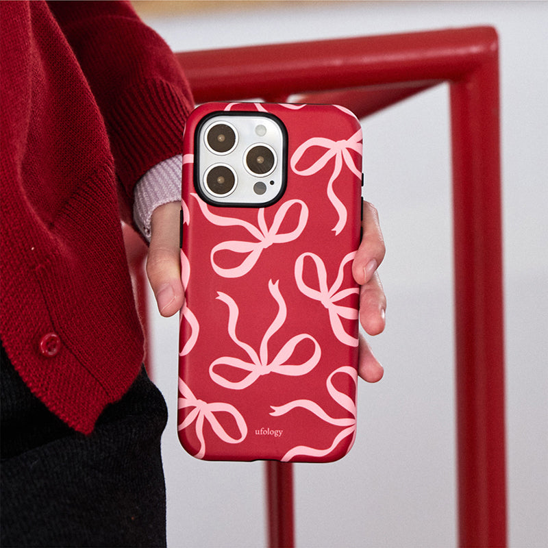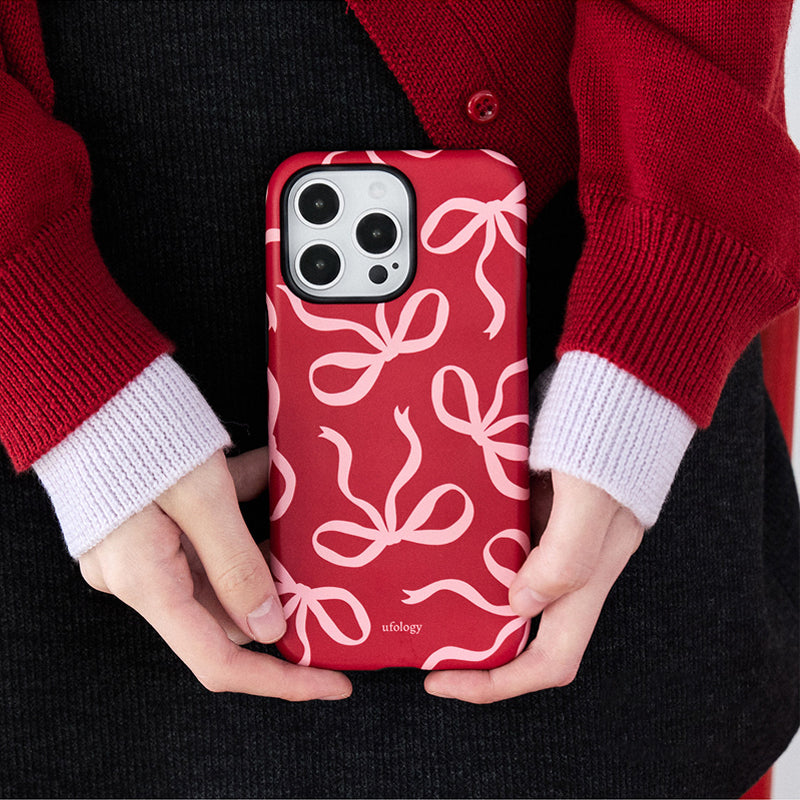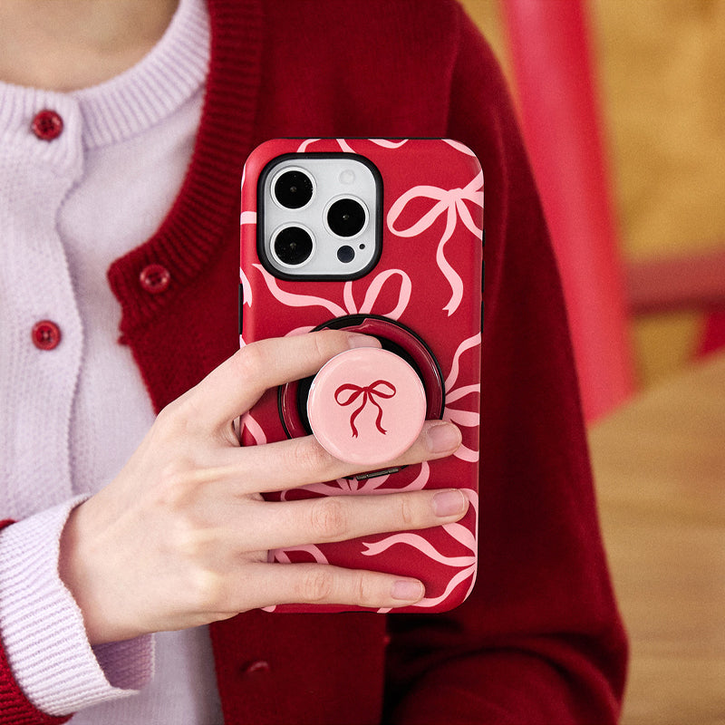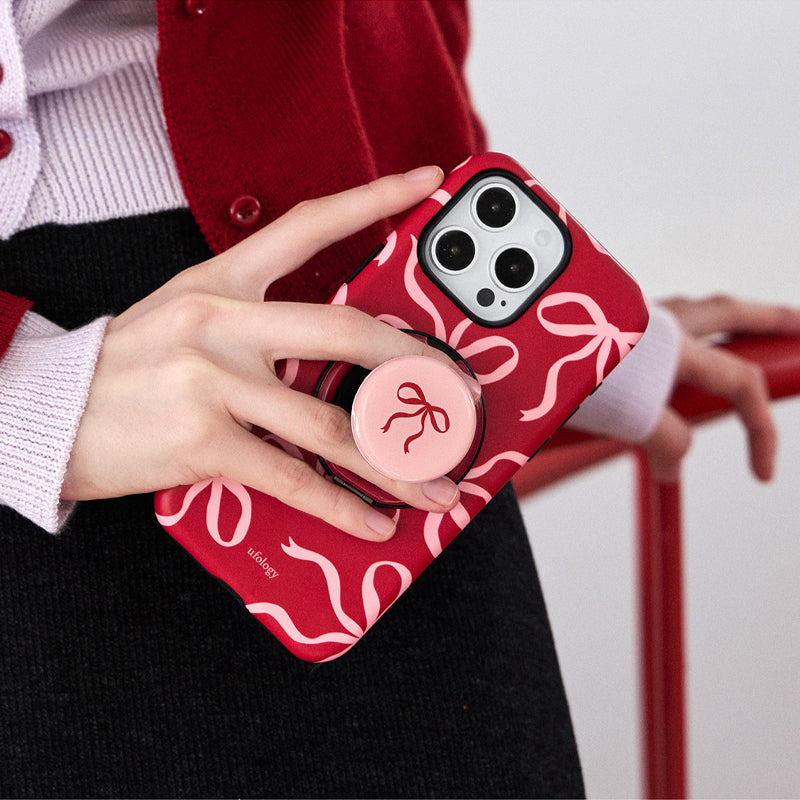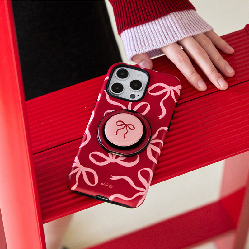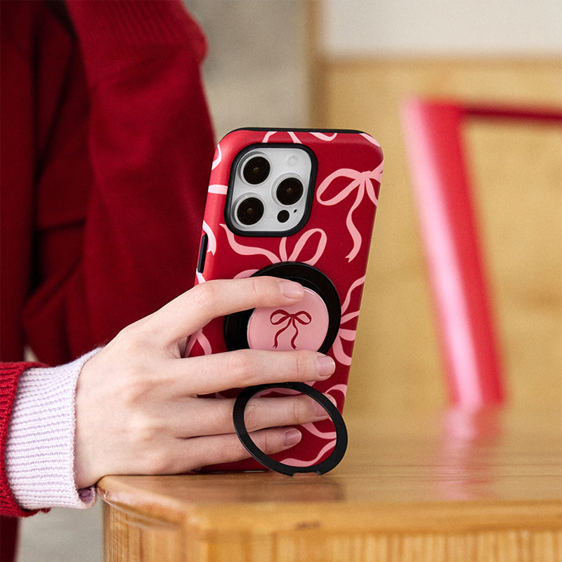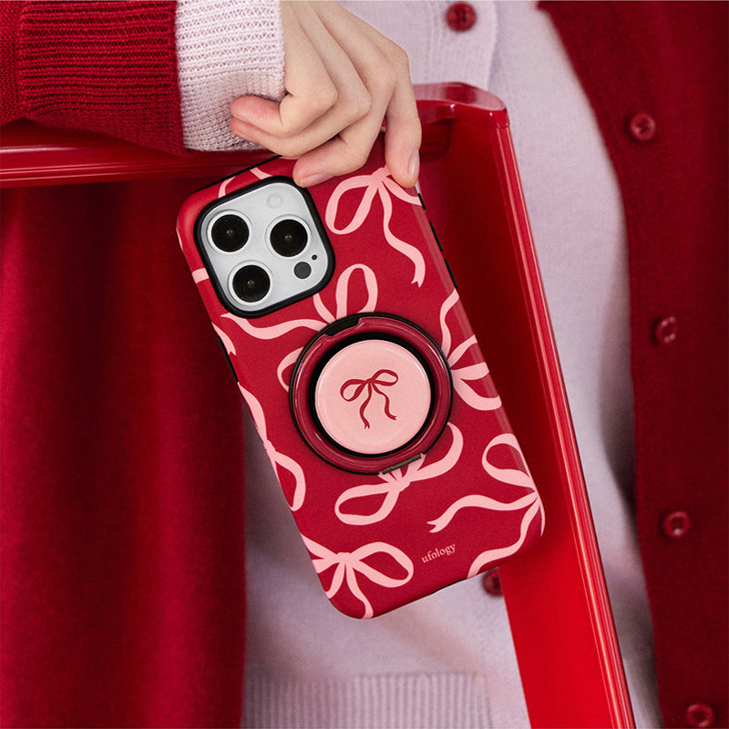 リボンデザインを施した、甘くて可愛らしいスマホケース。鮮やかな赤色に、リボンのアクセントが可愛さを引き立て、手元に優しさを添えます。回転式リングスタンドが搭載されており、動画視聴やビデオ通話時にも便利に使えます。