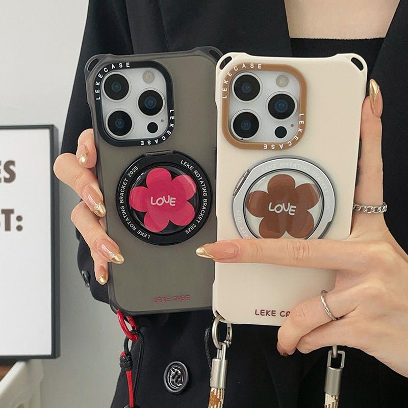 韓国風フラワーモチーフストラップ付き360°回転リングスタンド一体型スマホケース(2色展開)