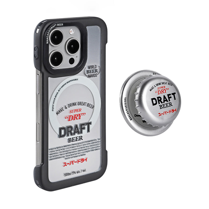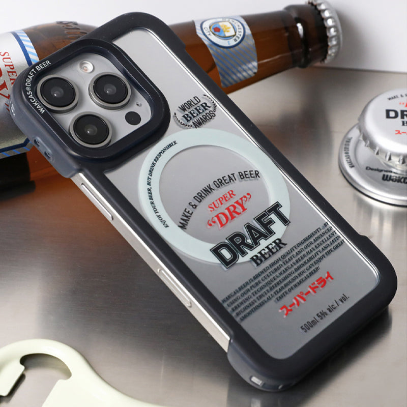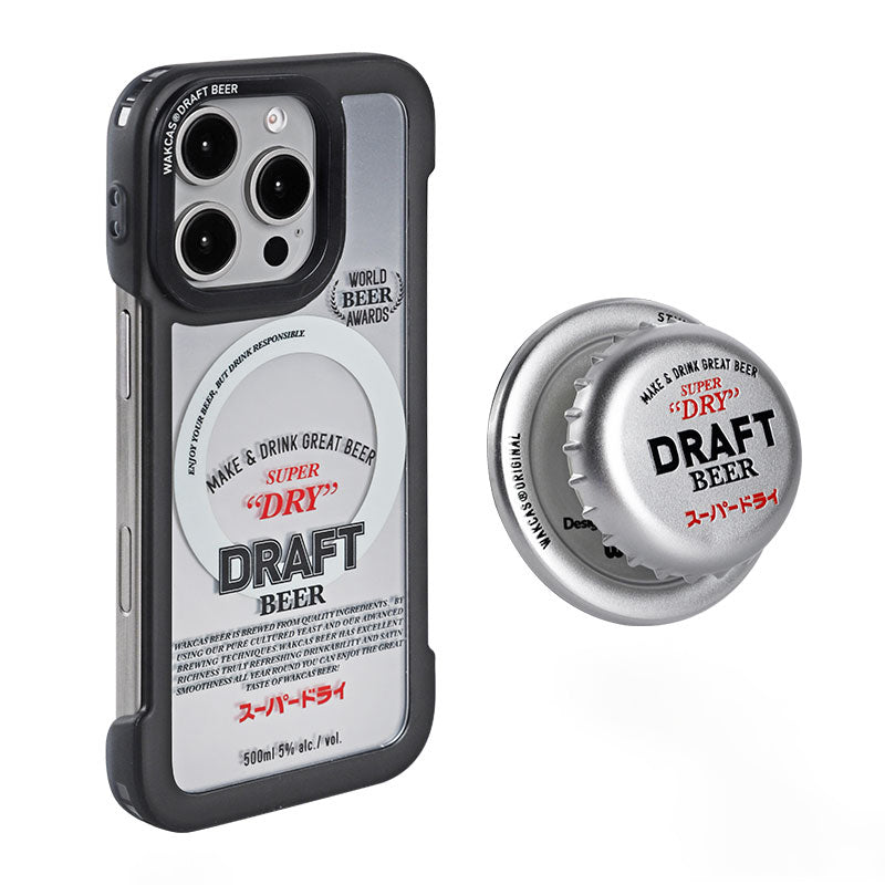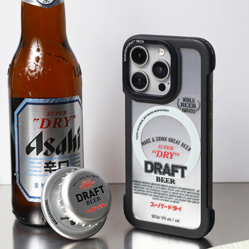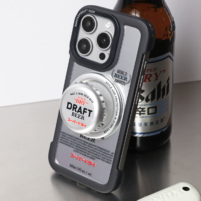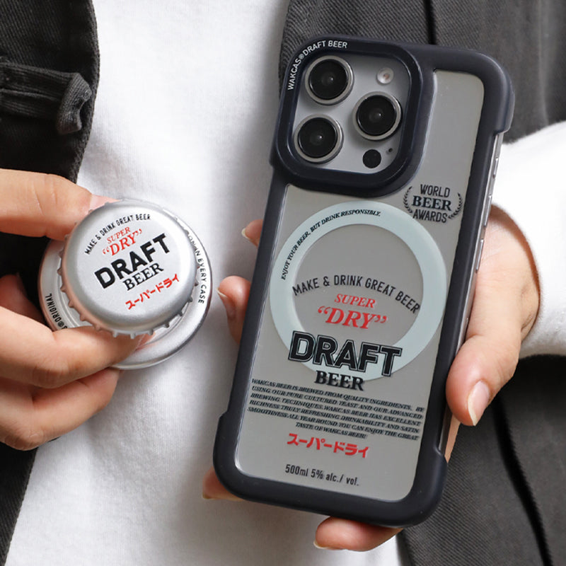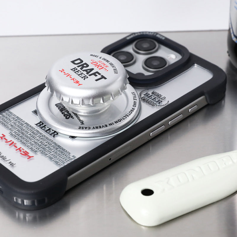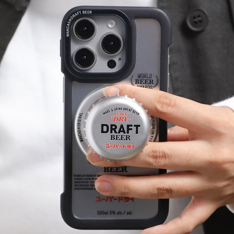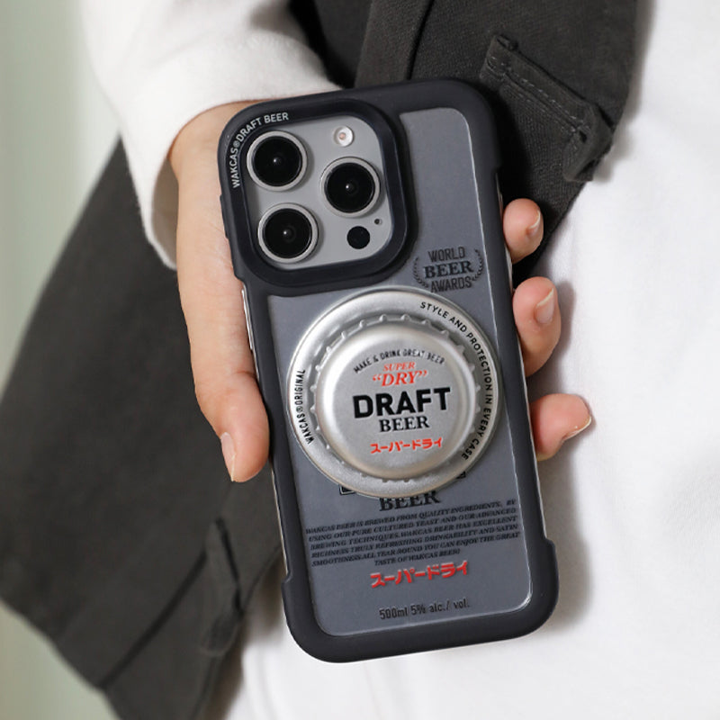 ビールモチーフのユニークなマグネット式スマホケース。ケース背面にはボトルキャップ型のスタンドが付いており、動画視聴や作業時に便利です。マグネット式でマグネットアクセサリーにも対応し、デザイン性と実用性を兼ね備えた、おしゃれで遊び心あるスマホケースです。