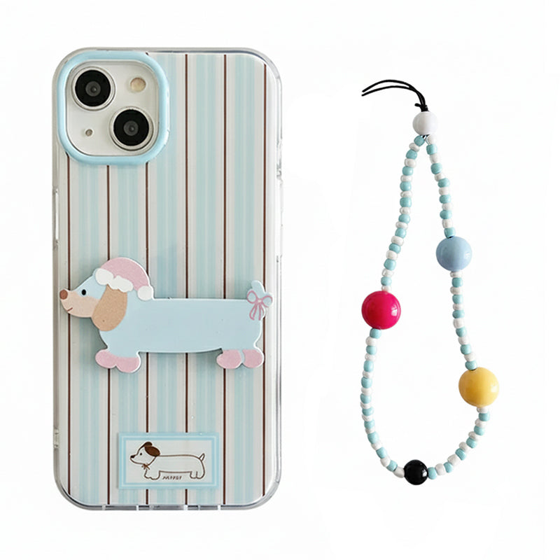韓国風ストライプ柄ダックスフンド立体デザインストラップ付きスマホケース