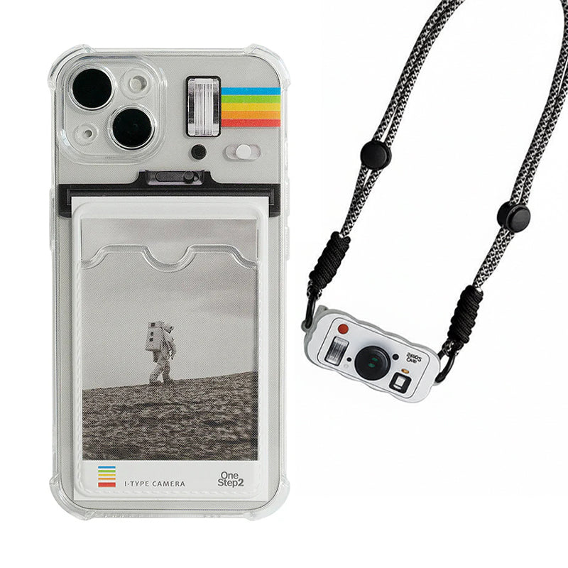 お気に入りのインスタントカメラ写真を持ち歩けるカードホルダー付きスマホケース。便利なストラップとクリップで、首掛けやバッグ取り付けもOK。おしゃれさと機能性を兼ね備えたアイテムです。