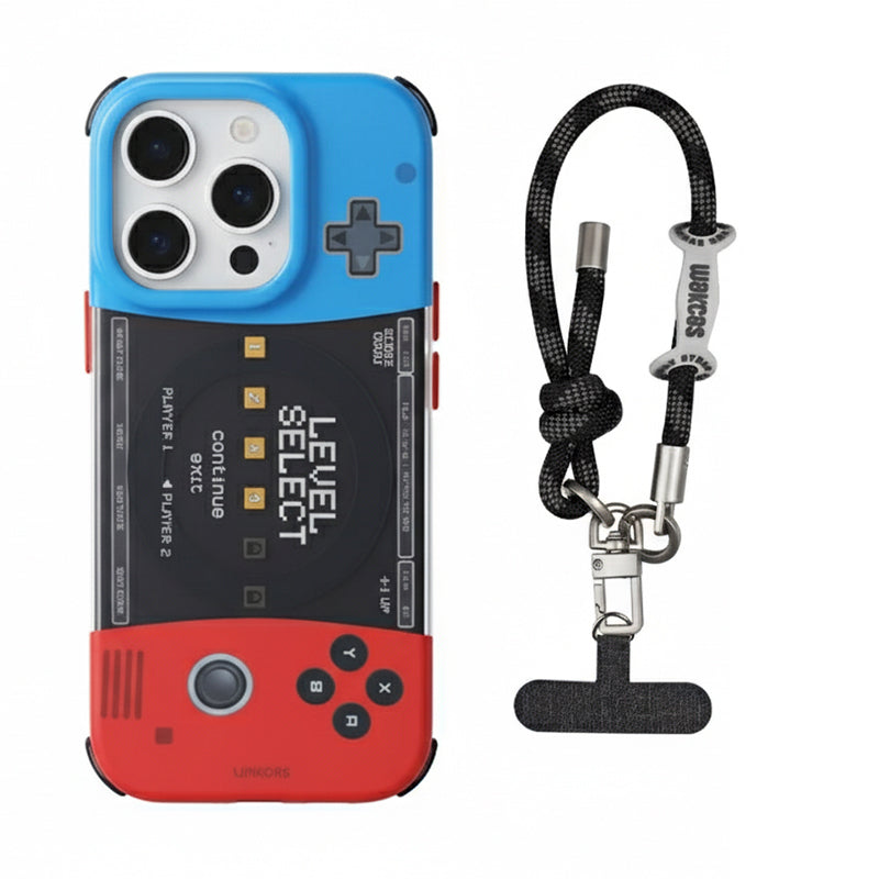 大胆な赤と青のバイカラー配色が目を引く、ゲーム機モチーフのオリジナルデザインスマホケース。マグネット式でカードポケットやスタンド機能付きアクセサリーにも対応し、機能性も充実。