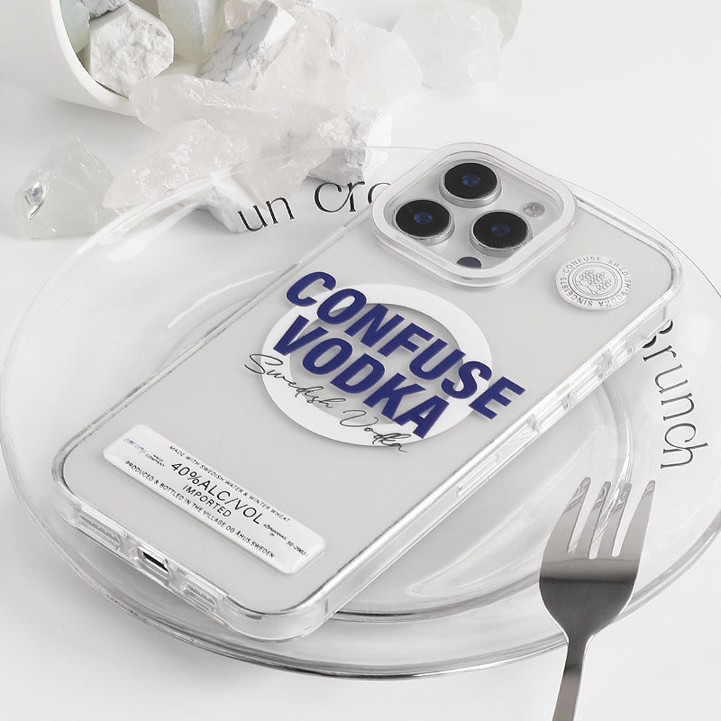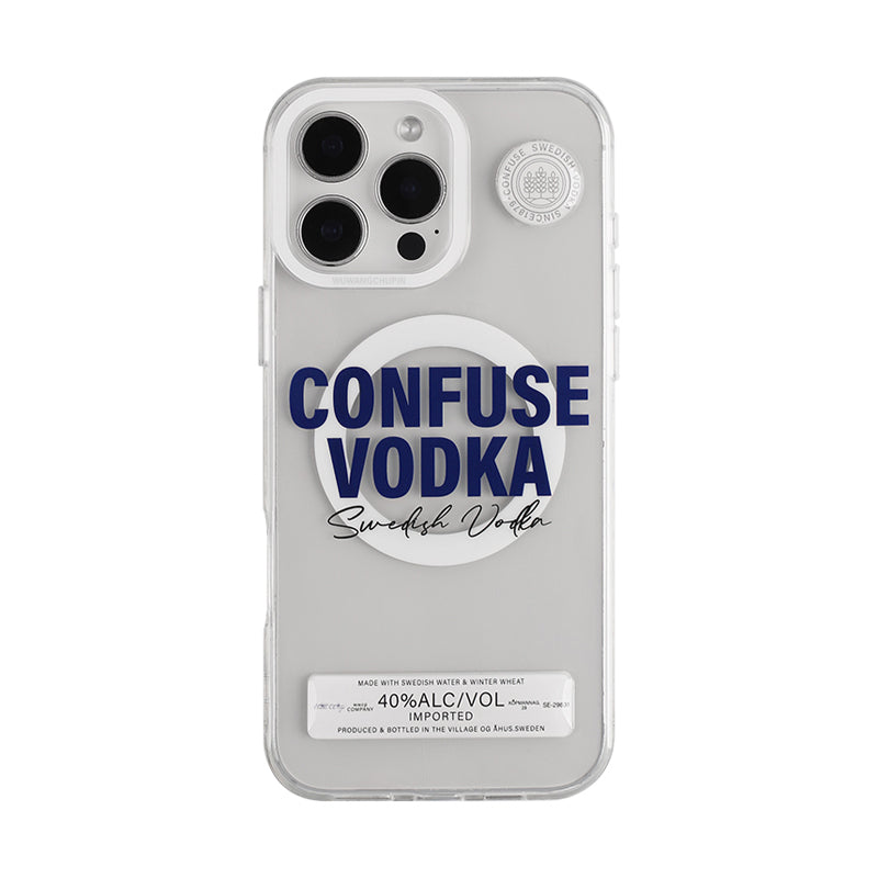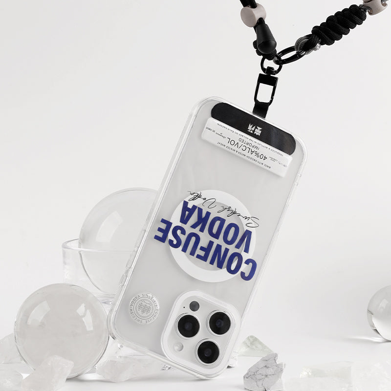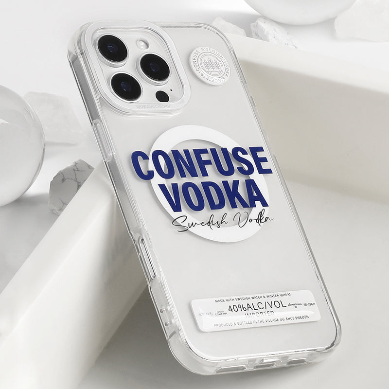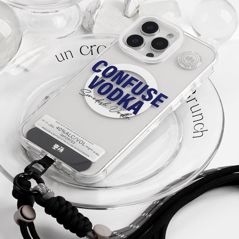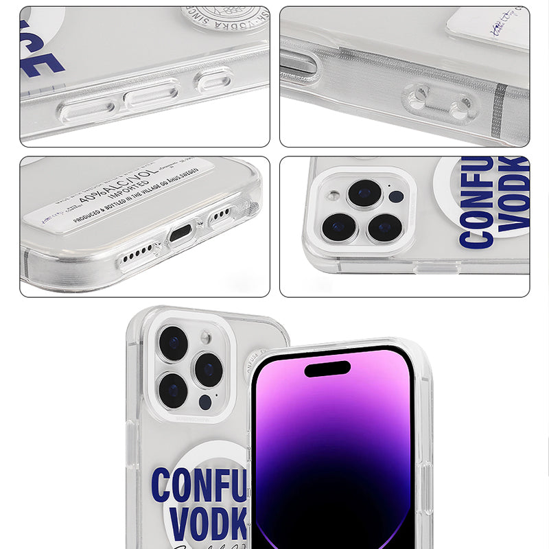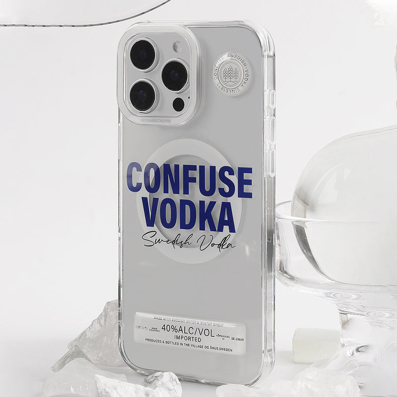 ウォッカをモチーフにしたユニークなデザインが目を引くクリアタイプのマグネット式スマホケース。背面の透明素材がスマホ本体のカラーを活かしつつ、遊び心のあるデザインを楽しめます。ストラップ付きで外出時の落下防止や持ち運びにも便利です。マグネット式でマグネットアクセサリーにも対応。デザイン性と実用性を兼ね備えた個性派スマホケースです。