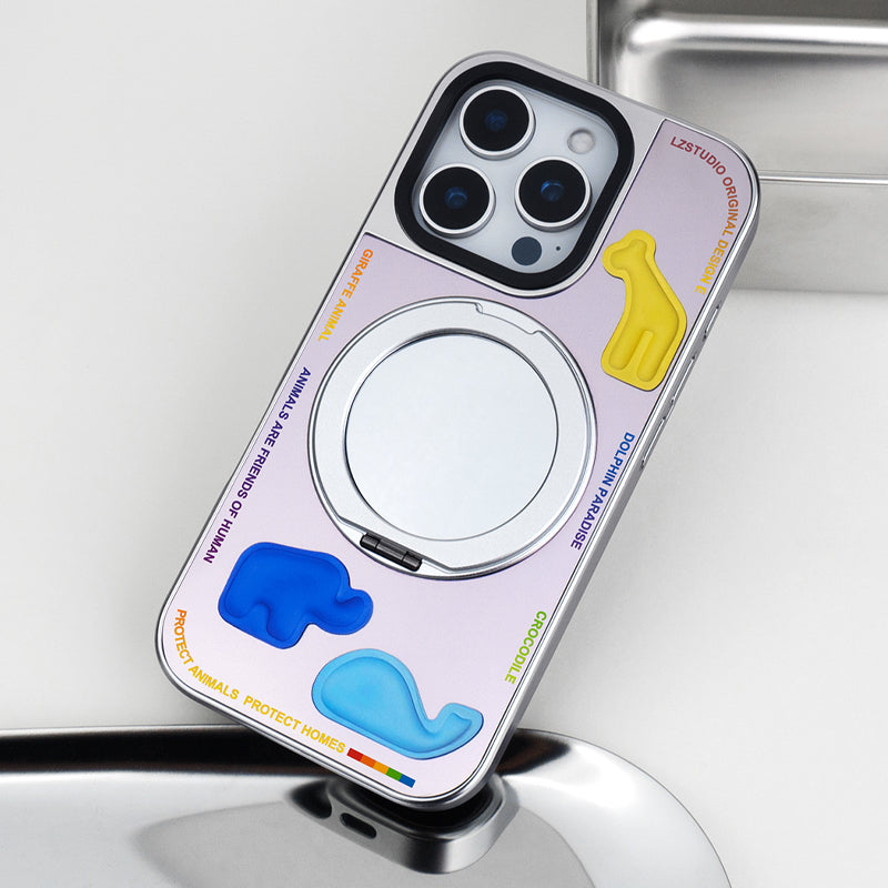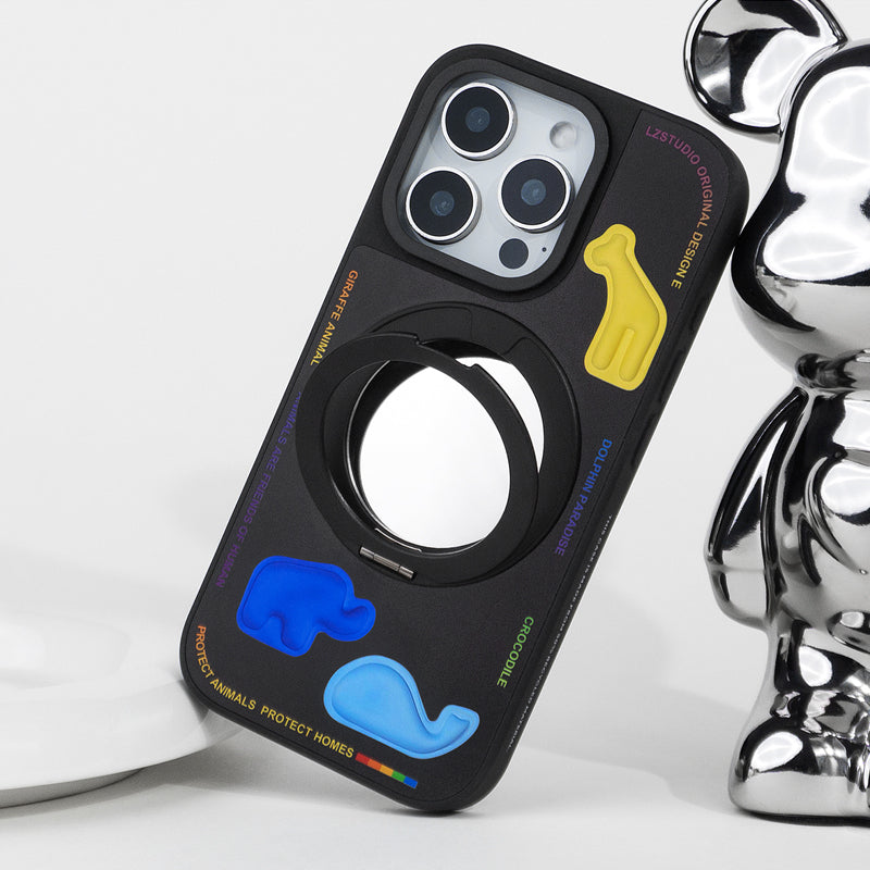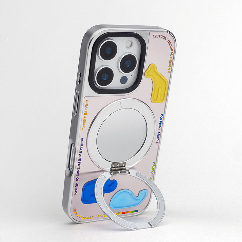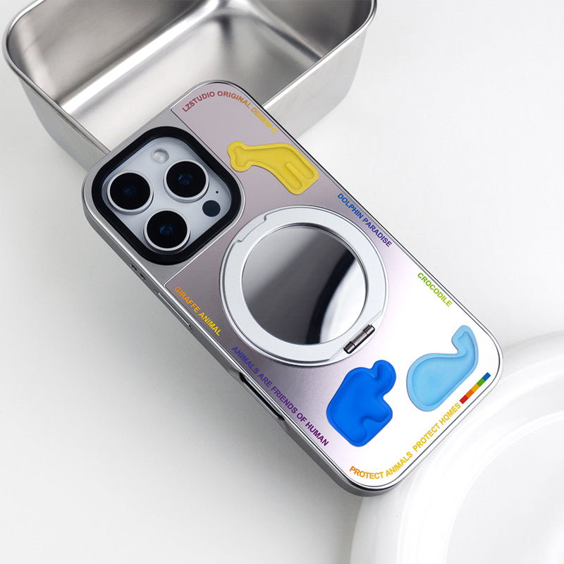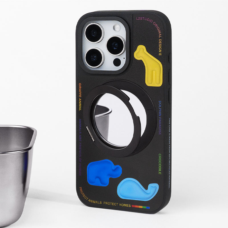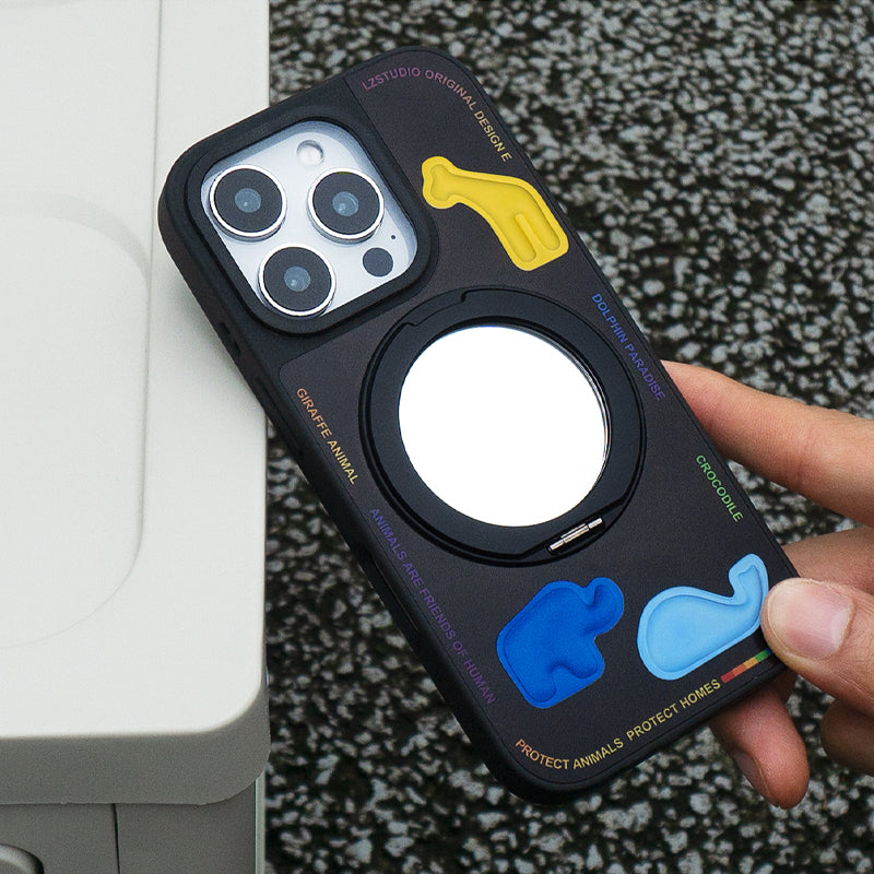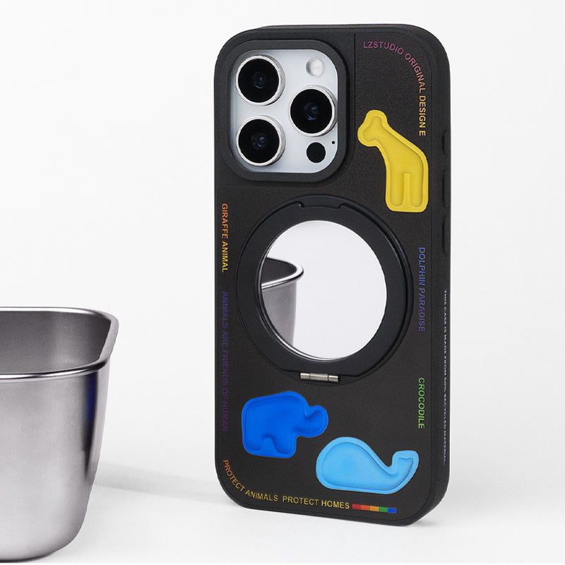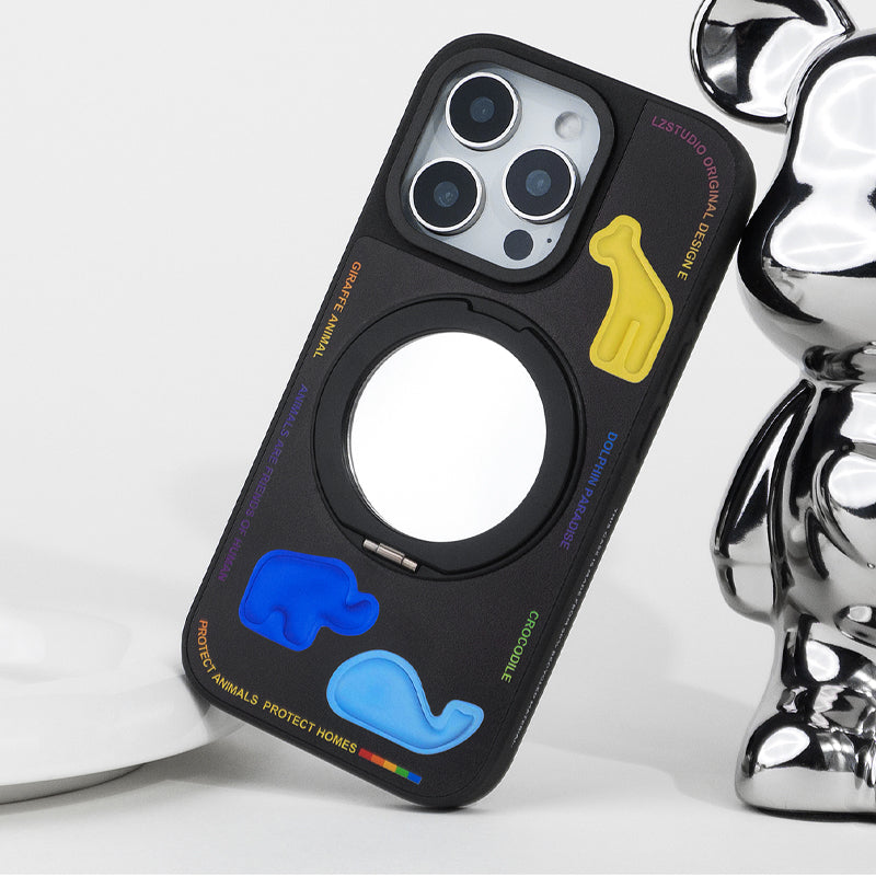 シンプル動物モチーフミラー付き回転スタンド一体型スマホケース