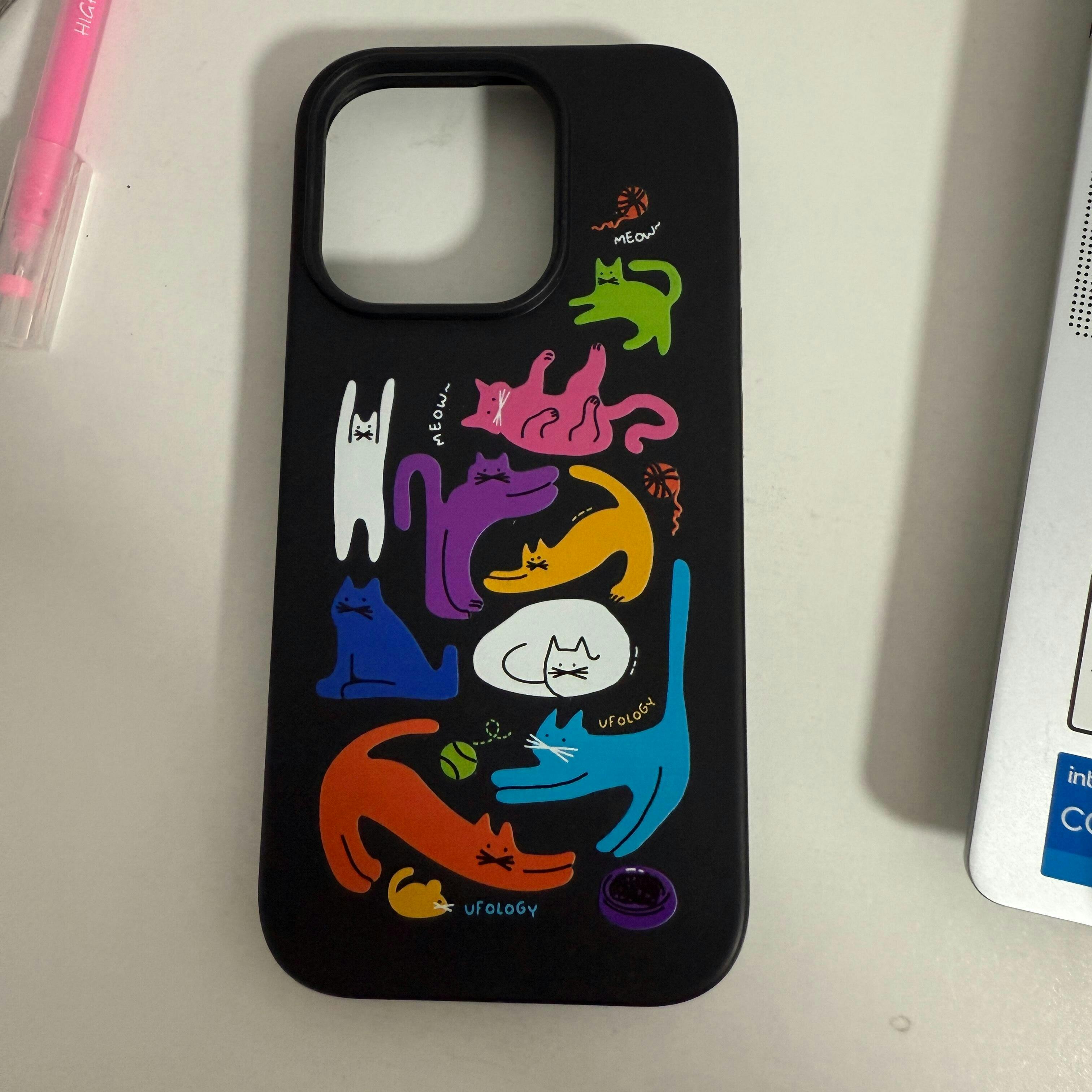 カラフルな猫イラストが目を引く、生分解性素材を使用したエコフレンドリーなスマホケース。マグネット式でカードポケット、スタンド機能付きアクセサリーにも対応し、デザイン性とエコ意識を兼ね備えた、可愛くて実用的なアイテムです。
