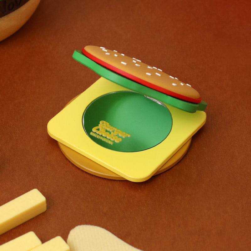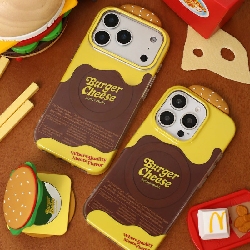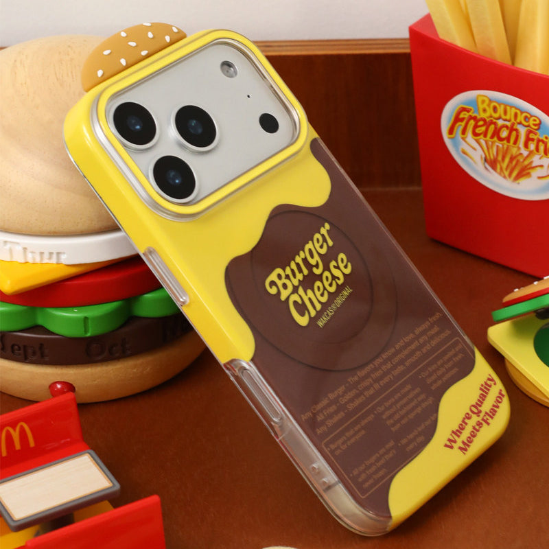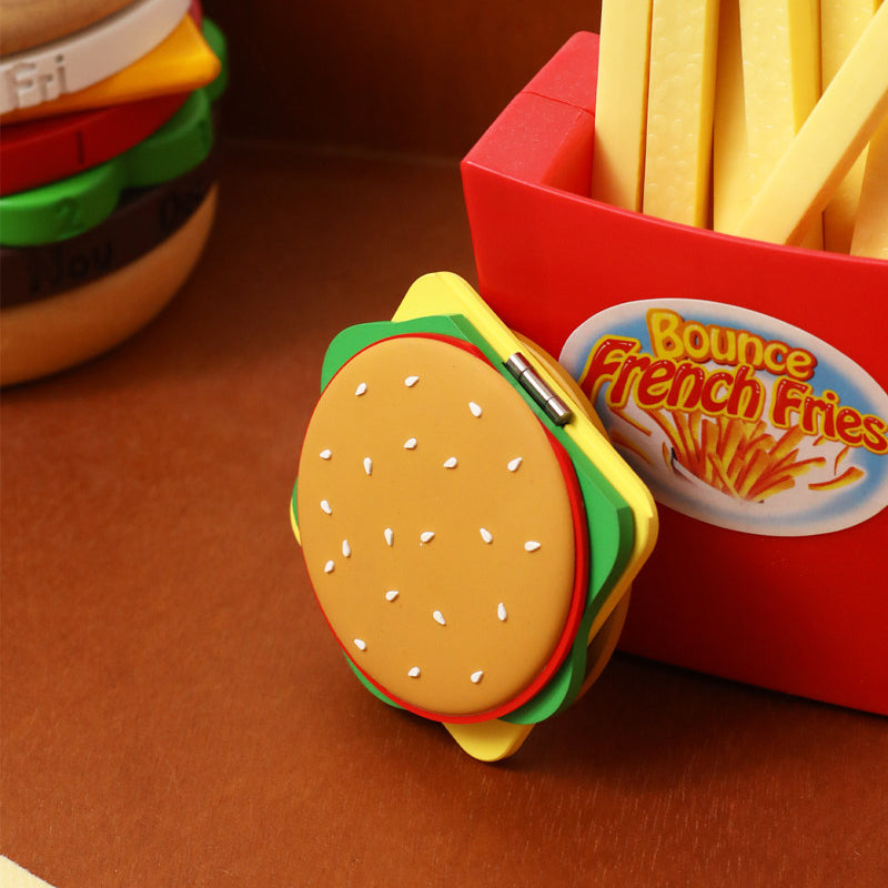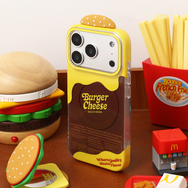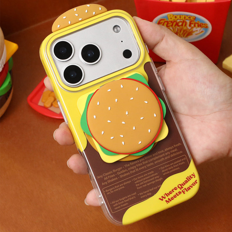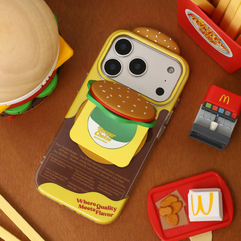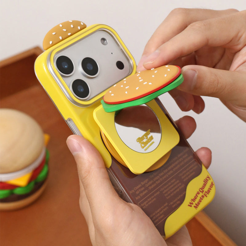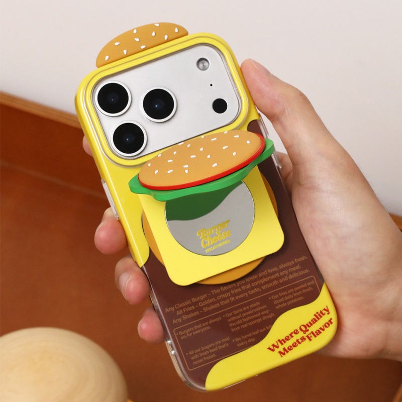 ユニークな立体バーガーをモチーフにした、遊び心あふれるデザインのスマホケース。ケース全体にバーガーテーマを取り入れ、思わず目を引く存在感を演出します。背面スタンド部分は立体的なバーガー形状で、開くと内側に小さなミラーを備えた隠し仕様。外出先での身だしなみチェックや、ちょっとした確認にも便利です。スタンドとして使用すれば、動画視聴やデスク上での操作も快適。マグネット対応仕様のため、対応アクセサリーやワイヤレス充電との併用もスムーズです。デザイン性・実用性・遊び心を兼ね備えた、毎日使うのが楽しくなるスマホケースです。